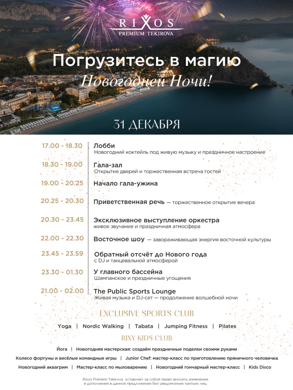 Доводим до Вашего сведения, что в течение сезона возможно изменение порядка и объема предоставления дополнительных услуг, заявленных в концепции любого из отелей.